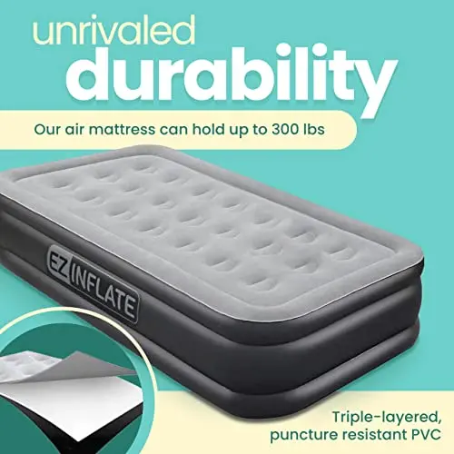 EZ INFLATE Air Mattress with Built in Pump - Twin Size Double-High Inflatable Mattress with Flocked Top - Easy Inflate, Waterproof, Portable Blow Up Bed for Camping & Travel