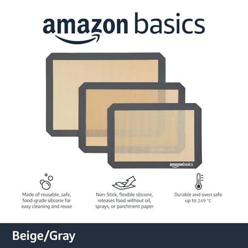 Amazon Basics Rectangular Non-Stick Silicone Baking Mat, Food Safe, Heat Resistant, 9"x13", 9.9"x14.8", and 16.5"x11.6", Beige/Gray, Pack of 3