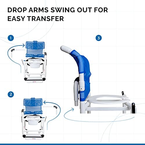 Rolling Shower Chair with Wheels & Drop Arms, Mesh Seat, 4 Locking Casters, Seat Belt, Sliding Footrest, Commode Pail – Fits Over Toilet, 300 lb Capacity – Institutional Grade | RL-1