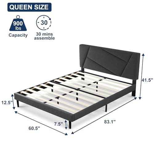 Marsail Queen Size Bed Frame, Sturdy and Durable with 12 Support Legs, 1300 lbs Capacity, Solid Wooden Upholstered Adjustable Headboard for 6"-12" Mattresses, Easy Assembly, Ideal Height, Dark Gray