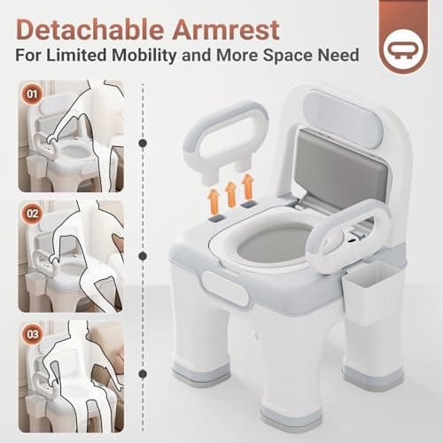 Loyoda Drop Arm Bedside Commode, Commode with Padded Seat and Backrest, 500lbs Capacity, 5.81QT Removable Bucket, Adjustable Height Portable Toilet for Adults, Gray