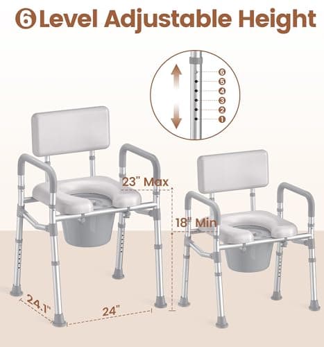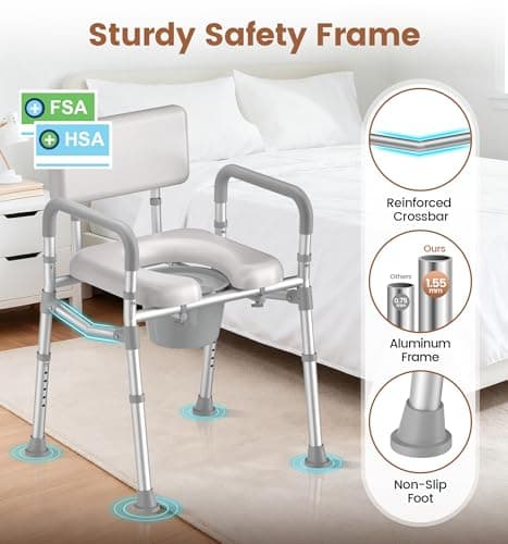 SOUNDFUSE Bedside Commode Chair with Padded Seat and Backrest, Aluminum Dual-Crossbar, Height Adjustable, Portable Toilet for Seniors and Adults, Potty Bucket and Splash Guard, 350 lbs Weight Capacity