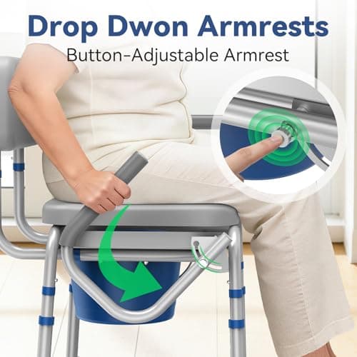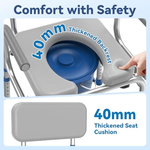Dignity Ultra-Premium Padded Commode Shower Chair, Comfortable Raised Toilet Seat with Padded Arm Handles and Backrest, for Seniors, Elderly, Adjustable Height, Includes Commode Pail and Lid, Blue