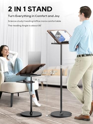 2 in 1 Adjustable Book Stand - Dual-Use Floor and Desktop Book Holder Stand, Height Adjustable 23.5-52 in, Elastic Page Clips for Music Sheet, Recipe, Tablet, Laptop-Black