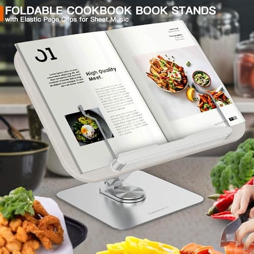 Book Stand for Reading, 360° Rotating Hands Free Book Holder, Adjustable Height and Angle, Page Clip for Cookbook, Recipe, Magazine, Laptop,Tablet, Foldable for Kitchen, Office, School