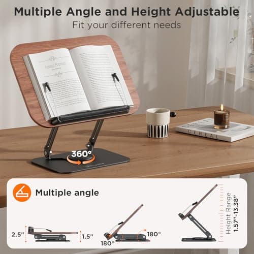 Book Stand for Reading, Multi-Angle & Height Book Holder with 360° Swivel Base, Lightweight Foldable Cookbook Stand for Kitchen, Office, Textbook, Recipe, Music Scores, Kindle, Tablet