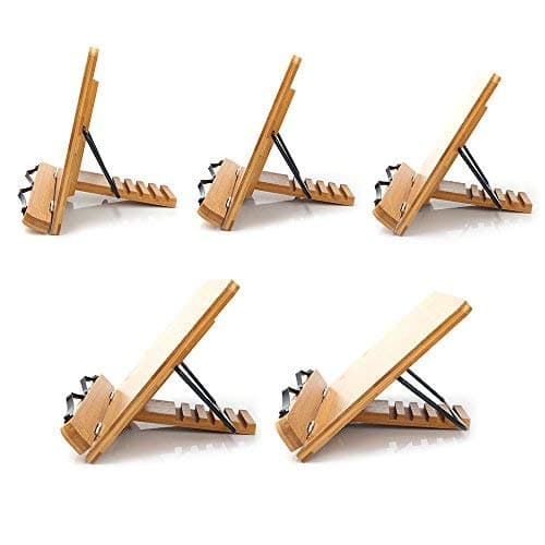 wishacc Bamboo Book Stand, Adjustable Book Holder Tray and Page Paper Clips-Cookbook Reading Desk Portable Stable Hard-Wearing Lightweight Bookstand-Textbooks Books