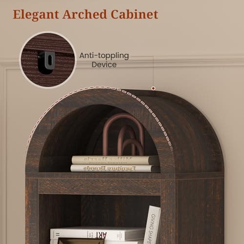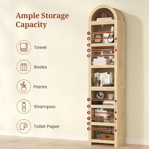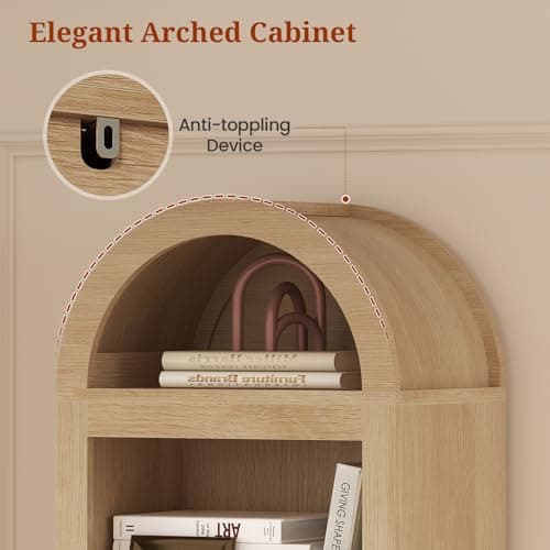IFGET 76" Tall Arched Bookcase, Farmhouse 5 Tiers Narrow Arched Bookshelf Cabinet with Adjustable Shelves, Modern Wooden Book Shelf w/Storage and Open Display Shelves for Living Room, Office-Natural