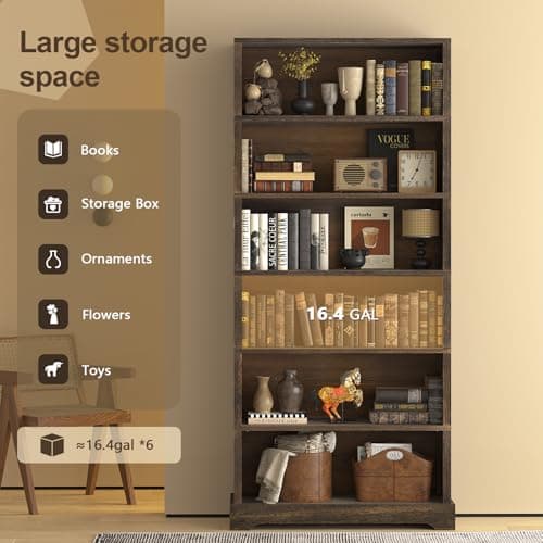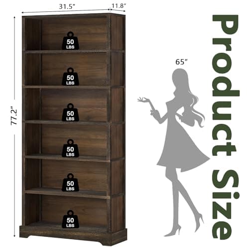 TVU 6-Tier Wooden Book Shelf, Floor-Standing Display Bookcase, 77.2" H x 31.5" W x 11" D Bookshelf, Farmhouse Style Book Case with Arched Base, Suitable for Living Room, Study, Office, Rustic Brown