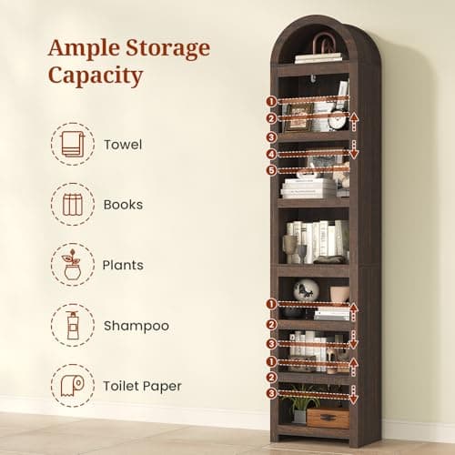 UPOSOJA 76" Tall Narrow Arched Bookcase,7-Teir Mid-Century Modern Bookshelf,Adjustable Shelves offering More Storage Space for Living Room,Kitchen,Home Office,Walnut