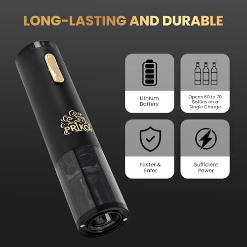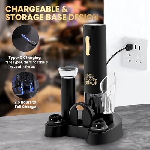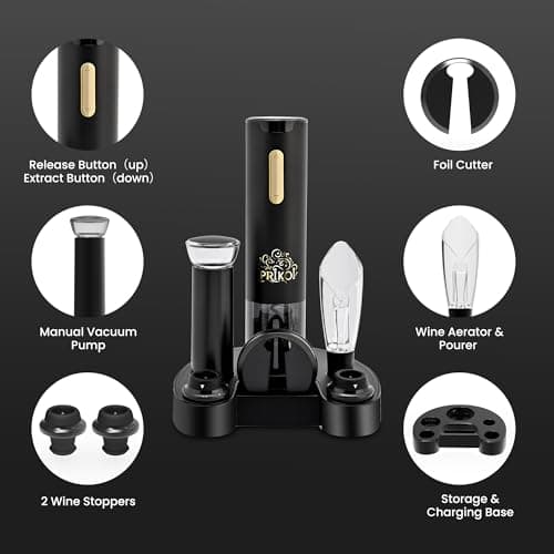 Prikoi Electric Wine Opener Set with Charging Base, Automatic Cordless Wine Bottle Opener with Aerator & Pourer, Foil Cutter, Vacuum Pump, and Stoppers for Home Party Christmas Day