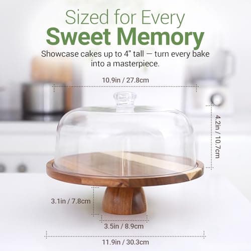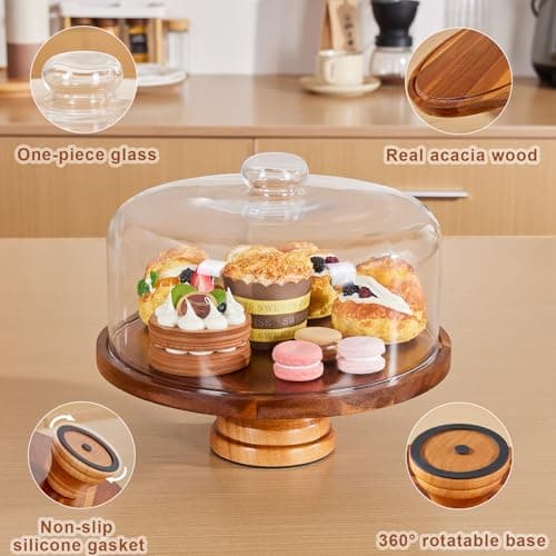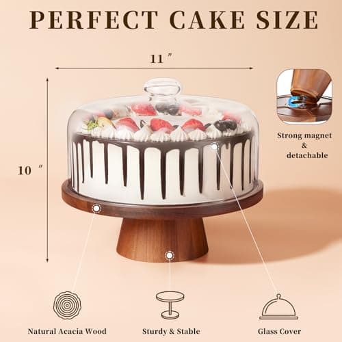 VIVIRBIEN Wooden Cake Stand with Lid, Acacia Cake Stand with Glass Dome, 11-Inch Versatile Dessert Stand with Strong Magnetic Pedestal, Cake Holder for Birthday/Kitchen/Party/Charcuterie