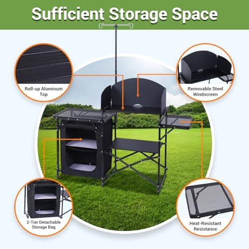 VEVOR Camping Kitchen Table, Outdoor Camp Cooking Table, Aluminum Portable Cook Station with 3 Storage Cupboard, Carrying Bag, Detachable Windscreen, Quick Set-up for BBQ Party Picnic RV Travel, Black