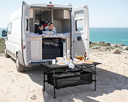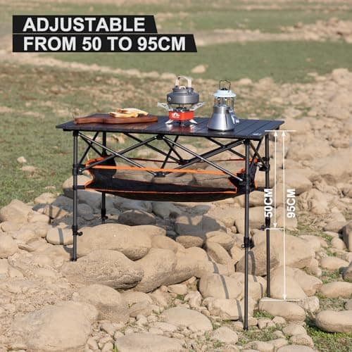 JOUYEK Folding Outdoor Camping Table with Adjustable Legs, Lightweight Aluminum Roll Up Camp Table with Carrying Bag, Mesh Storage Organizer, for Cooking, Picnic, Beach, Backyards, BBQ, Party