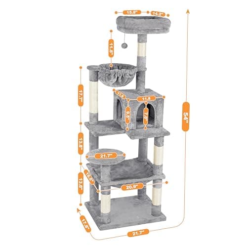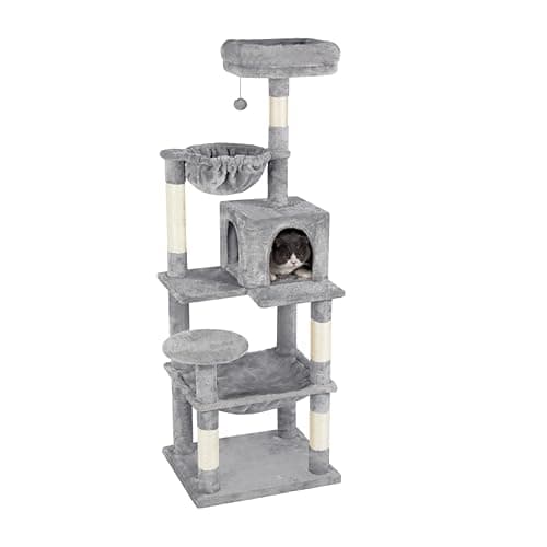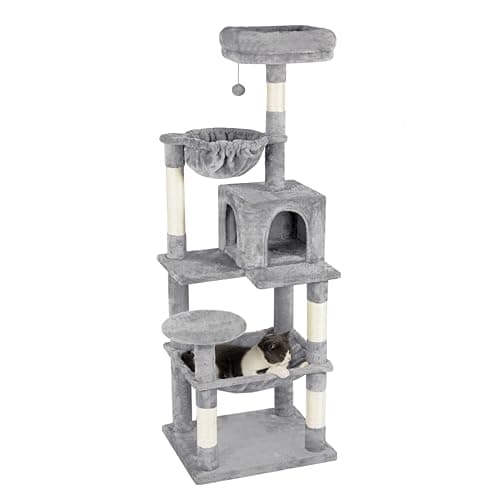 Feandrea Cat Tree, 56.3-Inch Cat Tower, Multi-Level Plush Condo with 11 Scratching Posts, 2 Perches, Hammock, Cave, Light Gray UPCT15W