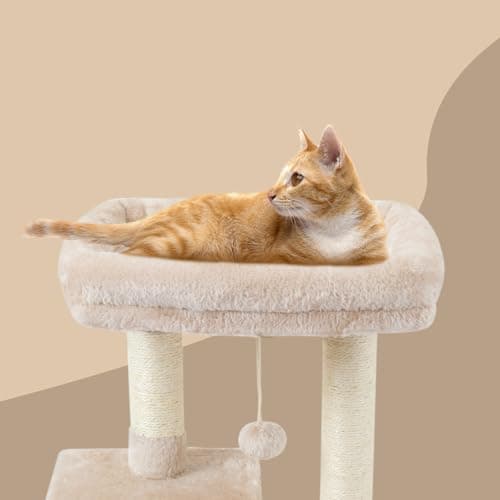 Amazon Basics Cat Tower with Hammock Bed and Scratching Post for Indoor Cats, Easy to Assemble, Interactive Hanging Ball, 15.8" x 15.8" x 19.7", Beige