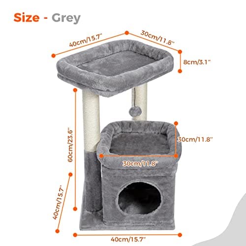 Cat Tree Tower Scratching Post for Indoor Large Cats, Small Cat Tree with Big Perch Bed, 28in Tall Trees House with Condo Cave, Toy Balls, Modern Climbing Furniture Platform for Kitten (Light Gray)