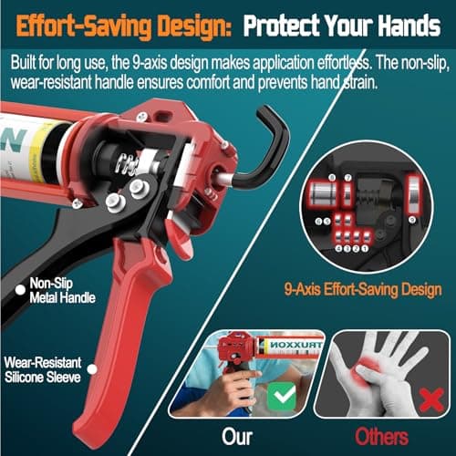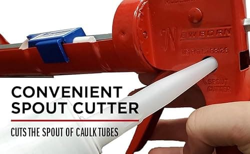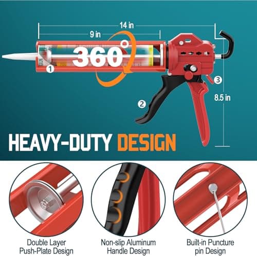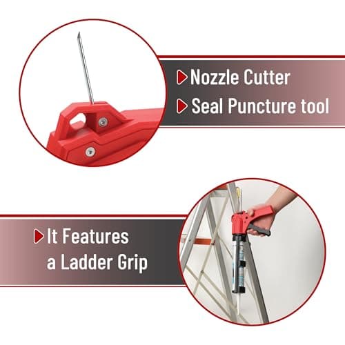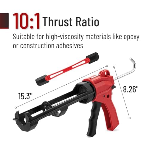Bates- Caulking Gun Tool, 10:1 Thrust Ratio, Black & Red, 360ยฐ Rotating Plastic Barrel, Caulk Gun with Spout Cutter, Seal Puncture Tool, Built-in Scraper and Finishing Tool