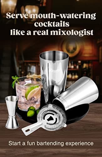 Cocktail Shaker, KITESSENSU 24oz Drink Shaker with Bartender Strainer, Measuring Jigger, Bar Mixing Spoon, Cocktail Recipe Guide, Professional Drink Mixer Set for Beginners, Silver