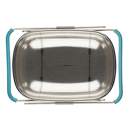 Rachael Ray Tools and Gadgets Over-The-Sink Colander/Strainer, 4.5 Quart, Stainless Steel with Agave Blue Handles