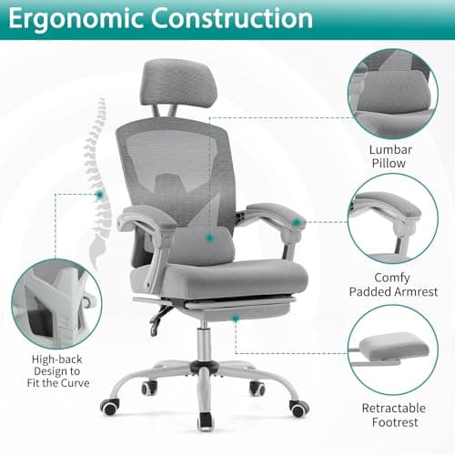 DUMOS Home Office Desk Chair with Footrest, High-Back Mesh Rolling Swivel Reclining Chairs with Wheels, Comfortable Headrest, Lumbar Support, Comfy Arms for Home, Office, Gaming, Student, Grey