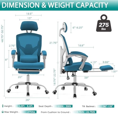 DUMOS Home Office Desk Chair with Footrest, High-Back Mesh Rolling Swivel Reclining Chairs with Wheels, Comfortable Headrest, Lumbar Support, Comfy Arms for Home, Office, Gaming, Student, Blue