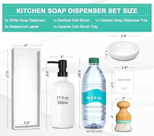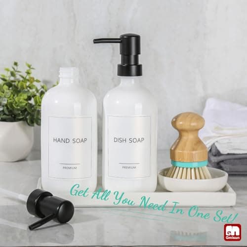 GMISUN Kitchen Soap Dispenser Set, 16 Oz Hand and Dish Soap Dispenser with Ceramic Tray & Bamboo Dish Brush, 2 Pack White Glass Liquid Pump Bottle, Modern Farmhouse Refillable Dish Soap Bottle