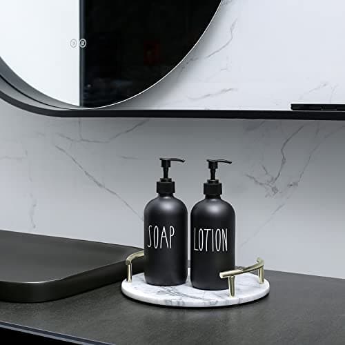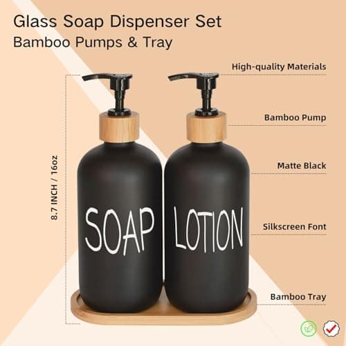 Black Soap Dispenser Bathroom Set, Set with Glass Dispenser, Bamboo Pumps & Tray. Hand and Lotion Suitable for Farmhouse Decor