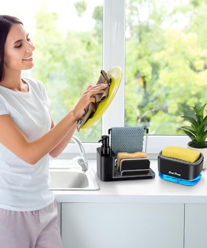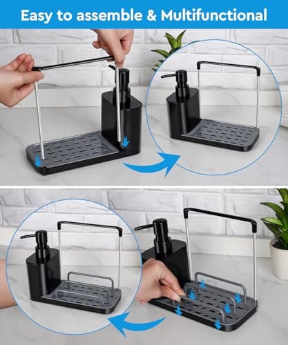 Kitchen Soap Dispenser Set, with Hand and Dish Soap, Sponge Caddy and Brush Holder 4-in-1 Kitchen Dual Soap Dispenser Set for Kitchen Sink, Bathroom - Black