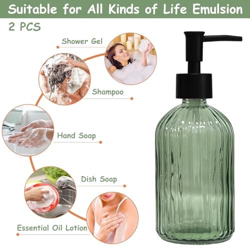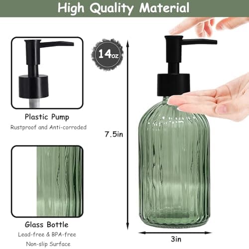 Green Glass Soap Dispenser Set with Black Pump, 13.5oz Refillable Liquid Hand Soap Dispenser, Lotion Dish Soap Dispenser for Modern Home Decor, Bathroom, Kitchen Countertop, Hotel(2 Pack)