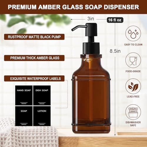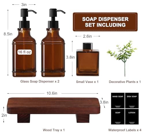 [Luxury] Kitchen Soap Dispenser Set - 16OZ Amber Glass Bottle, Stainless Steel Pump, Instant Dry Tray, Waterproof Labels, Non-Slip Silicone Pad, and Dish Brush | Upgrade for Your Kitchen and Bathroom