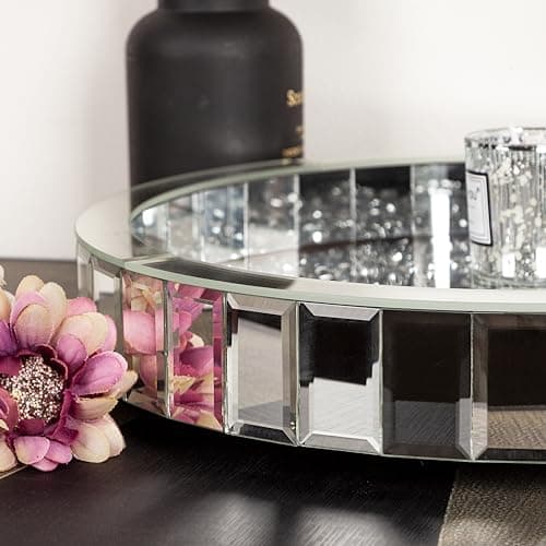 Blingworld 14" Mirrored Tray with Lazy Susan, Easy Access, Super Gorgeous Round Tray with Crushed Diamond Silver Finish - Perfume Organizer & Jewelry for Dresser