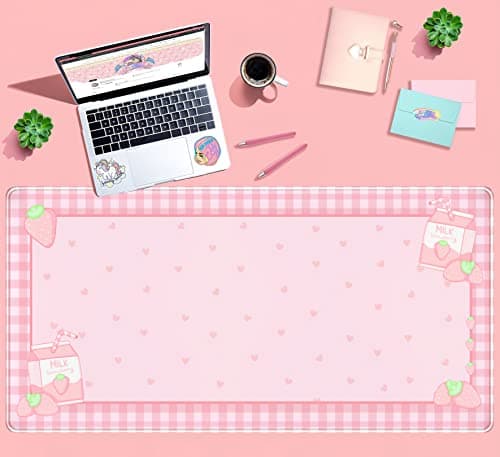 Cute Pink Plaid Desk Mats Strawberry Milk Gaming Desk Pad, Kawaii Extended Mouse Pad Kawaii Large Keyboard Mats XXL, Laptop Mat for Desk, Desktop Mat Mousepad Office Decor for Women 31.5"x15.75"