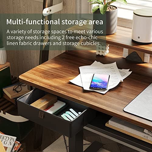 FEZIBO 66 Inch Executive L Shaped Standing Desk with 2-Drawer File Cabinet, Electric Height Adjustable Stand up Desk, Home Office Modern Wood Computer Desk with Shelves, Black Frame/Dark Walnut Top