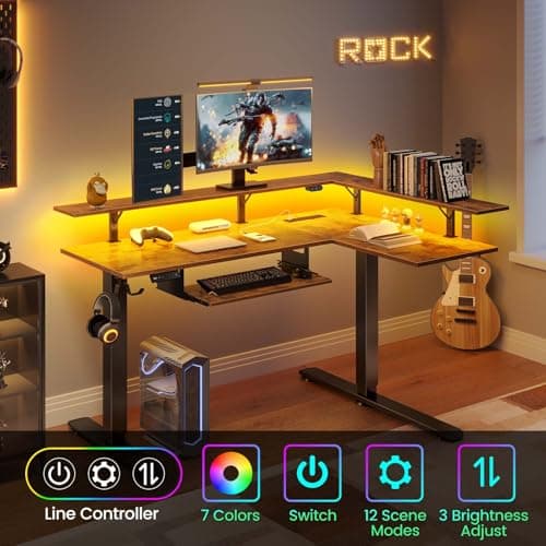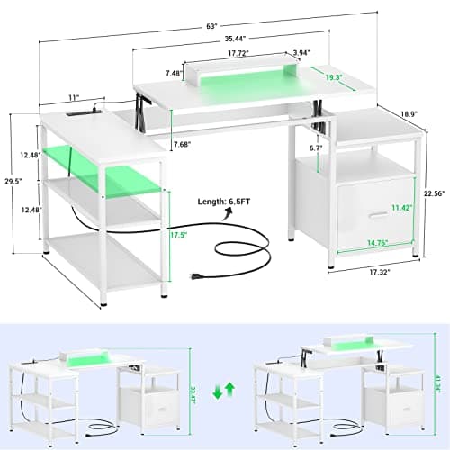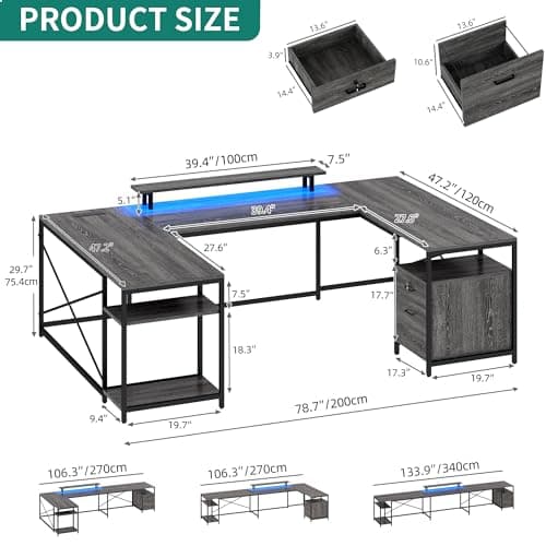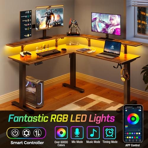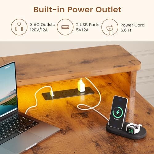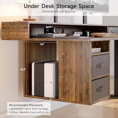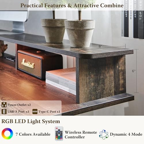Furologee 61" Computer Desk with Power Outlet & LED Lights, Reversible Gaming Desk with File Cabinet & Monitor Stand for Home Office, Writing Study Table with Storage Shelves and Drawer, Rustic Brown