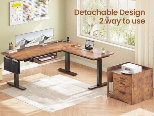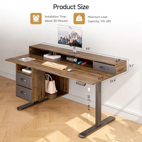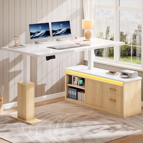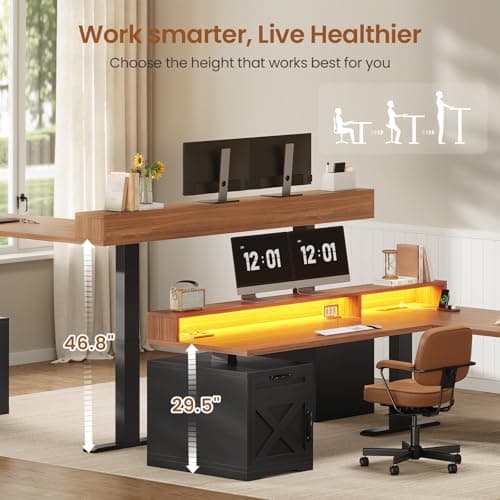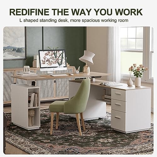 BANTI 63" Executive L Shaped Electric Standing Desk: 1.18" Thick Desktop, Height Adjustable, Integrated File Cabinet & 3 Drawers, Privacy Panel, AC/USB Charging Ports, Elegant Light Walnut Finish