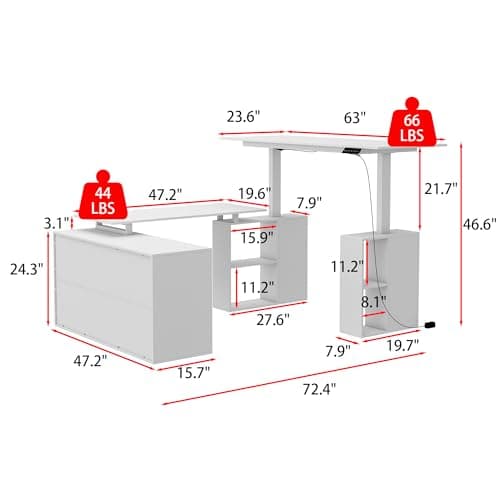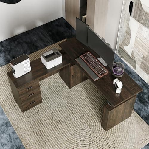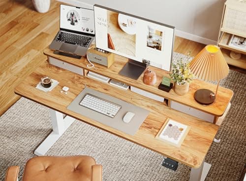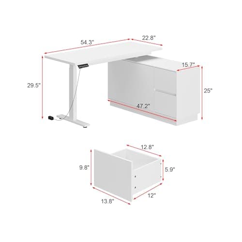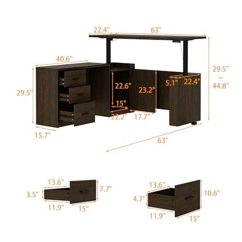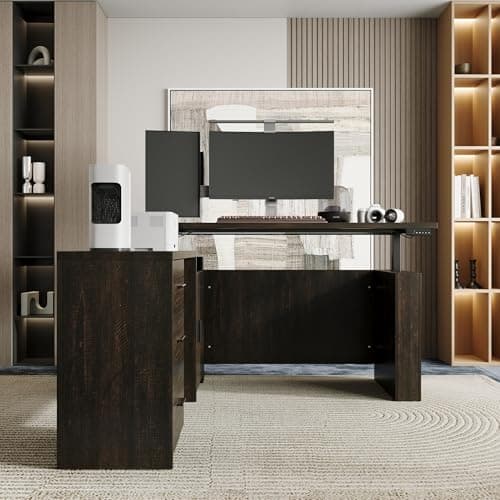 Homsee 63" W L-Shape Standing Desk with Storage Cabinet, Electric Height Adjustable Corner Stand Up Computer Desk with Drawers for Home Office, Brown