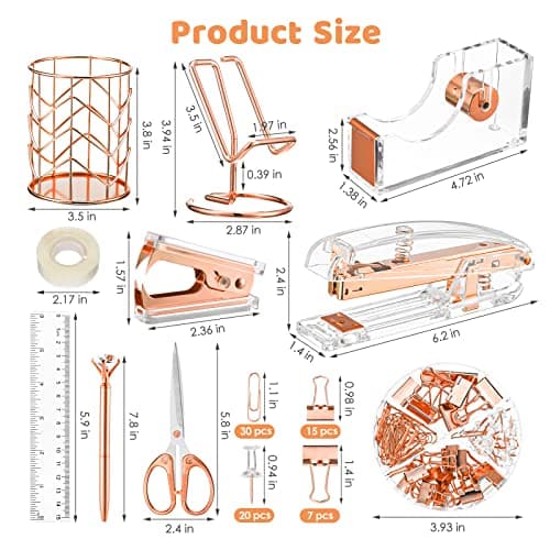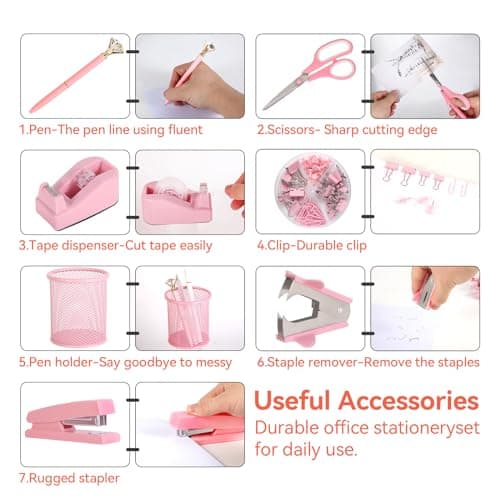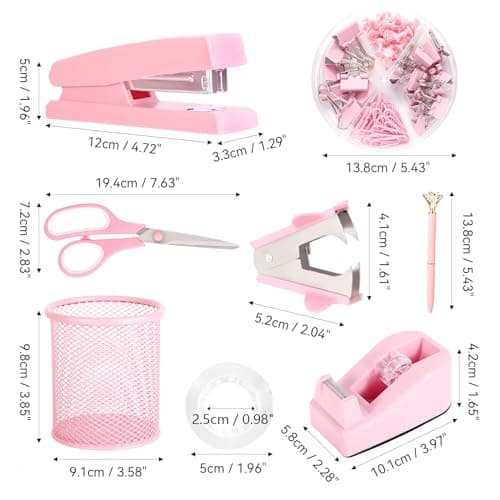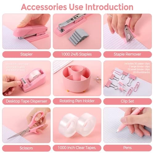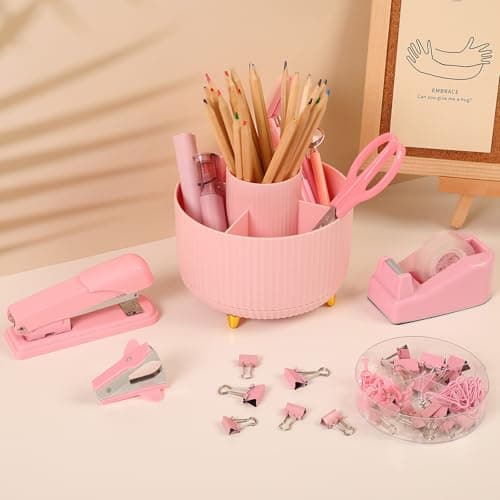 SKYDUE Pink Desk Accessories 10Pcs, Rotating Pen Holder for Desk, Stapler, Staple Remover, Tape Dispenser,2pcs Tape Refills, Binder Paper Clips Kit, Scissor,Pink Office School Supplies