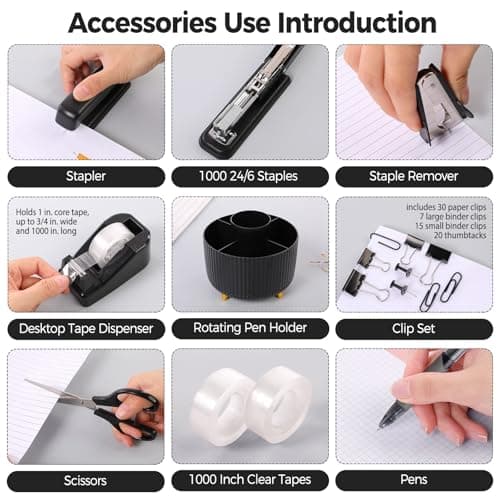 SKYDUE Black Office Supplies, Black Office Desk Accessories 10PCS, Pencil Holder for Desk, Stapler, Tape Dispenser, Scissors, Ruler, Clips and 1000pcs Staples, Desk Supplies Set