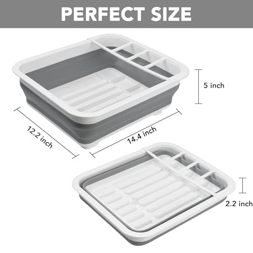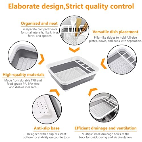 Kitchen Details Collapsible Dish Drying Rack | Space Saver | Aerated Bases Drain Holes | Plates, Bowls, Utensils Compartments | Countertop and Sink Storage | White/Grey
