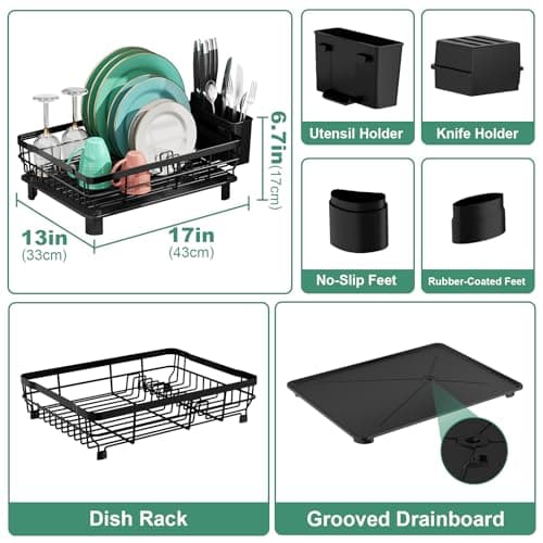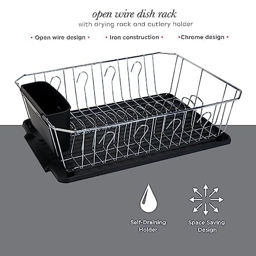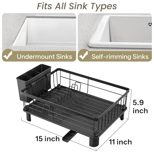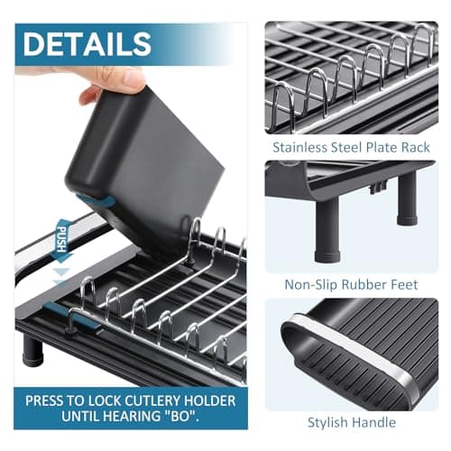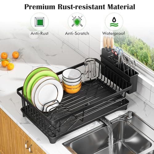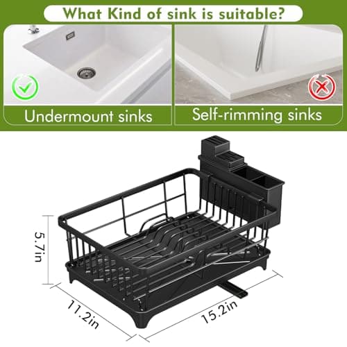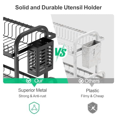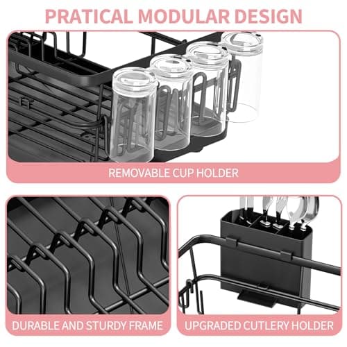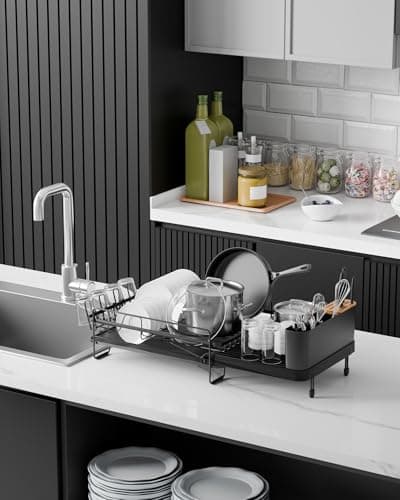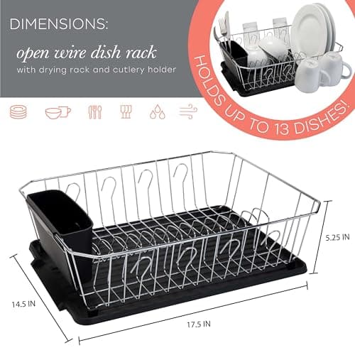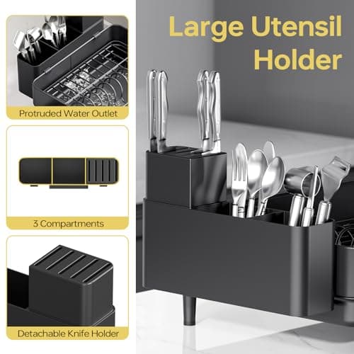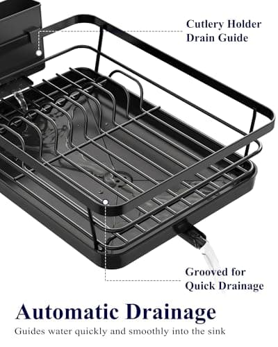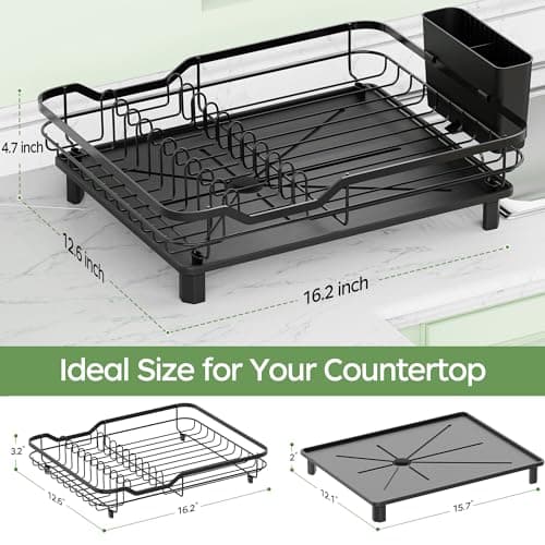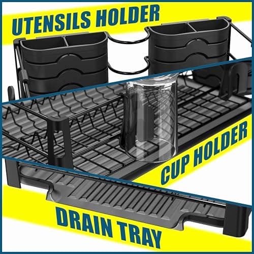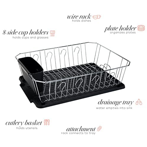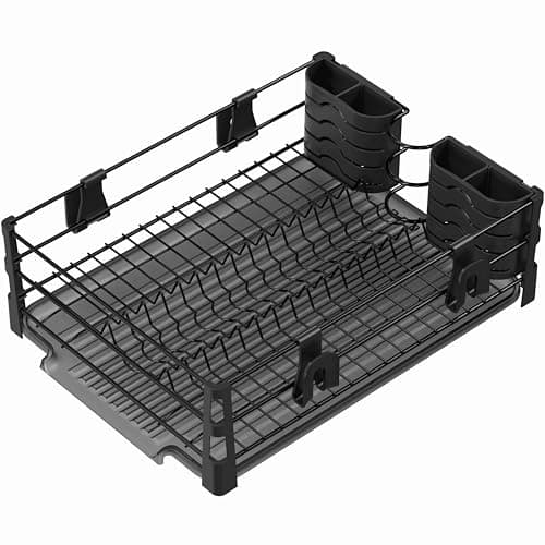 Kitsure Dish Drying Rack for Kitchen Counter, Stainless Steel Sink Organization and Storage Essentials with Cutlery Holder, Home and Appartment Decor, 12''W x 15.5''L, Black