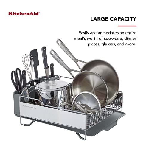 KitchenAid Large Capacity Full Size Rust Resistant Dish Rack with Angled Drain Board and Removable Flatware Caddy, Light Grey
