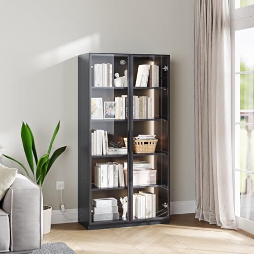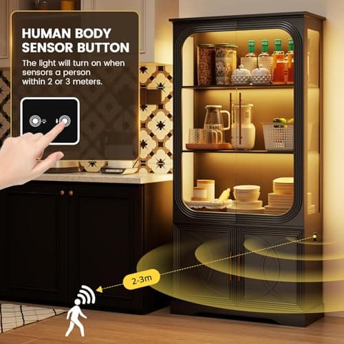 Aauro Home Display Cabinet with Glass Doors, Curio Cabinet with 3 LED Lights and Human Body Sensor, Bookcase with 4 Shelves Storage Cabinets, Black