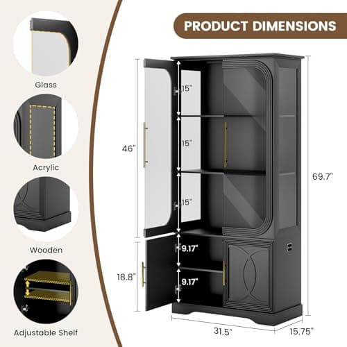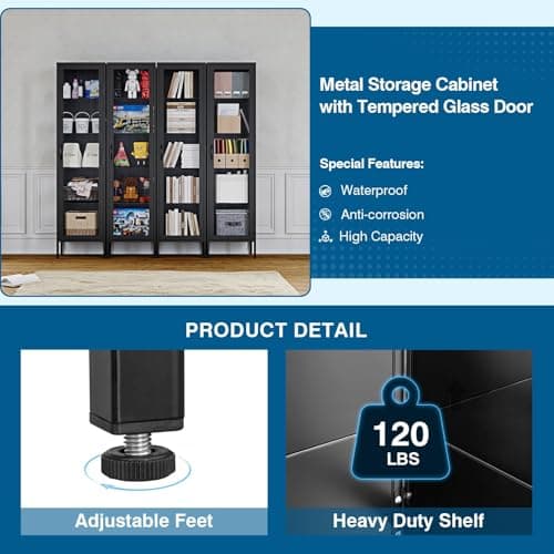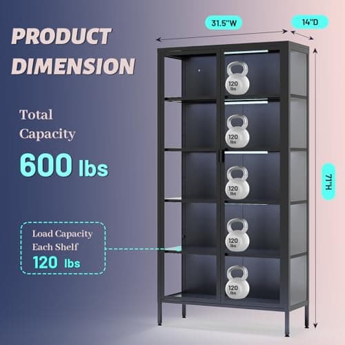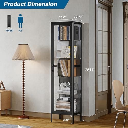 PEUKC Display Storage Cabinet with Glass Doors, 71 Inches Metal Curio Cabinets with 4 Adjustable Shelves, HD&Tempered Glass Cabinet Display Case for Home, Office, Pantry, Assemble Required (Black)