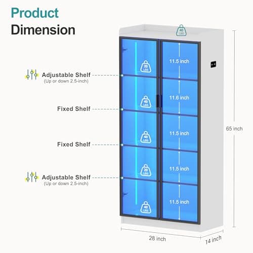 Lvifur 65" LED Display Cabinet with Lights for Living Room, 5 Tier Bookcase with Adjustable Shelves for Office, Tall Storage Cabinet with Human Body Induction for Collectibles (White)