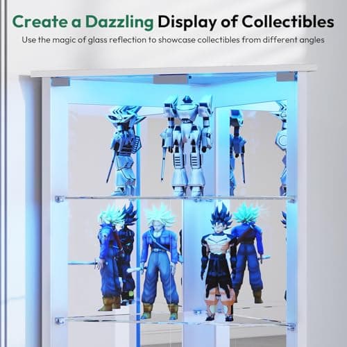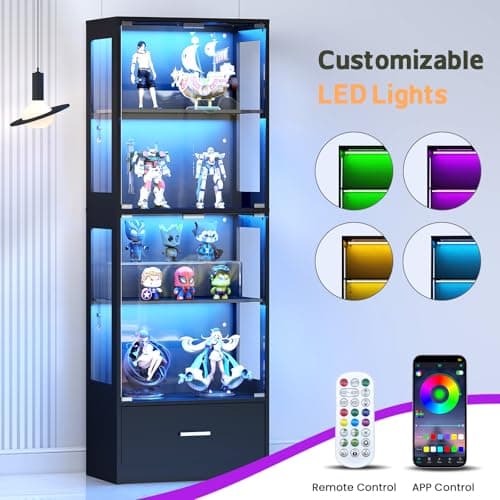 Eltean Display Cabinet with Glass Doors and LED Lights, Glass Display Cabinet with 3 Adjustable Shelves,4 Tier of Storage Space Curio Cabinet for Bedroom Living Room Homeoffice Dining Room