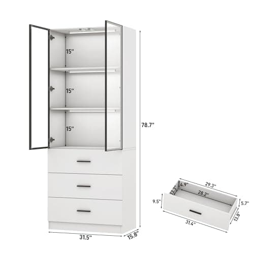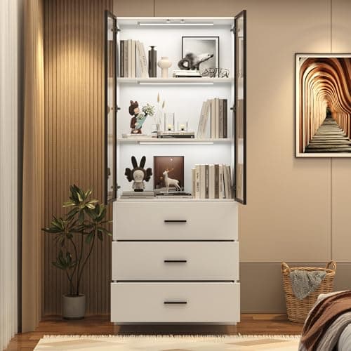 chartustriable 79" Tall Display Cabinet with LED Sensor Light & Pop-up Glass Doors & Drawers, Modern Bookcase Curio Storage Cabinet for Bedroom, Living Room, Office, White
