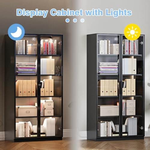 Lvifur 5 Tier Display Cabinet for Living Room, LED Bookcase with Human Body Induction Lights, 65” Tall Curio Cabinets with Adjustable Shelves for Office (Black)