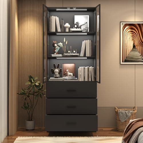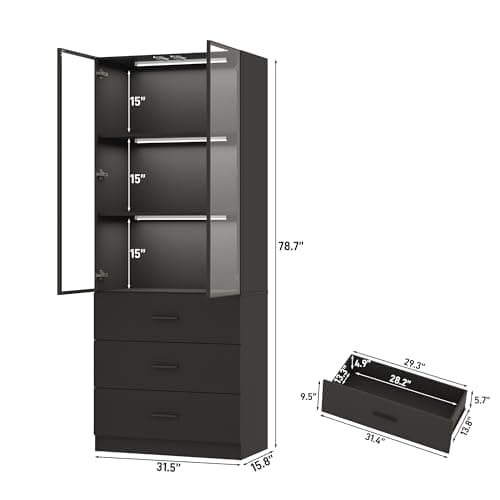 chartustriable 79" Tall Display Cabinet with LED Sensor Light & Pop-up Glass Doors & Drawers, Modern Bookcase Curio Storage Cabinet for Bedroom, Living Room, Office, Black