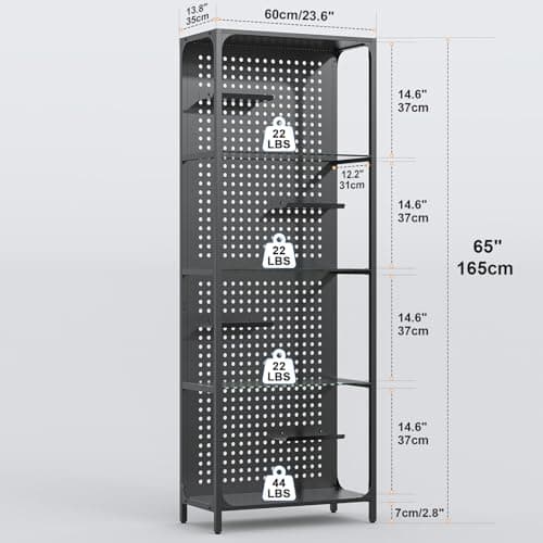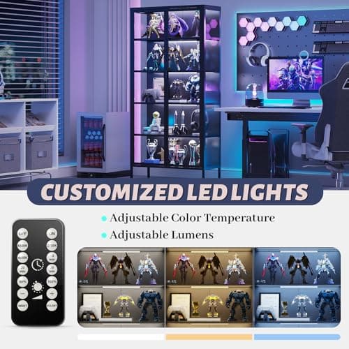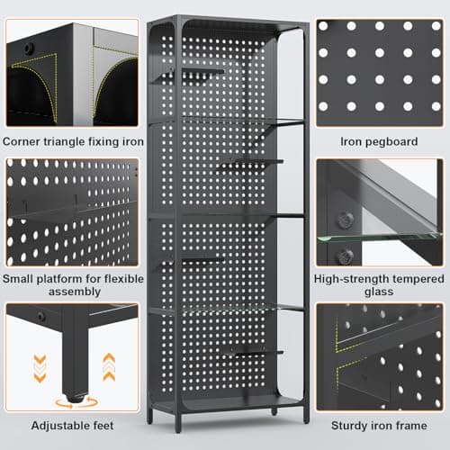 Saudism Glass Display Shelf for Collectibles, LED Black Shelf, Curio Cabinet, Lighted Tall Narrow Shelf with Pegboard Steel Frame for Gaming Room, Floor Lamp with Shelves, Living Room, Bedroom, Large